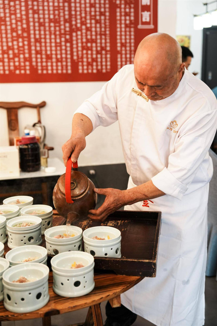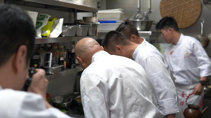 “这次两头乌佛手馒头里的红烧肉是片形的,别看每份只有小小一块,那是从三四斤两头乌五花肉中切出的25块肉。”除了用料讲究,对于装盘造型,小伙子也跟着师父们一起琢磨,红烧肉搭配黄花菜不能放到同色系的盘子上,要选青瓷盘烘托出主角。“师父常说要对食材有敬畏,把每道菜当成自己的作品去创作,才能很自信地端上餐桌。”