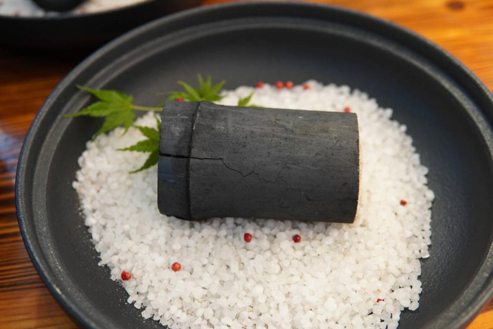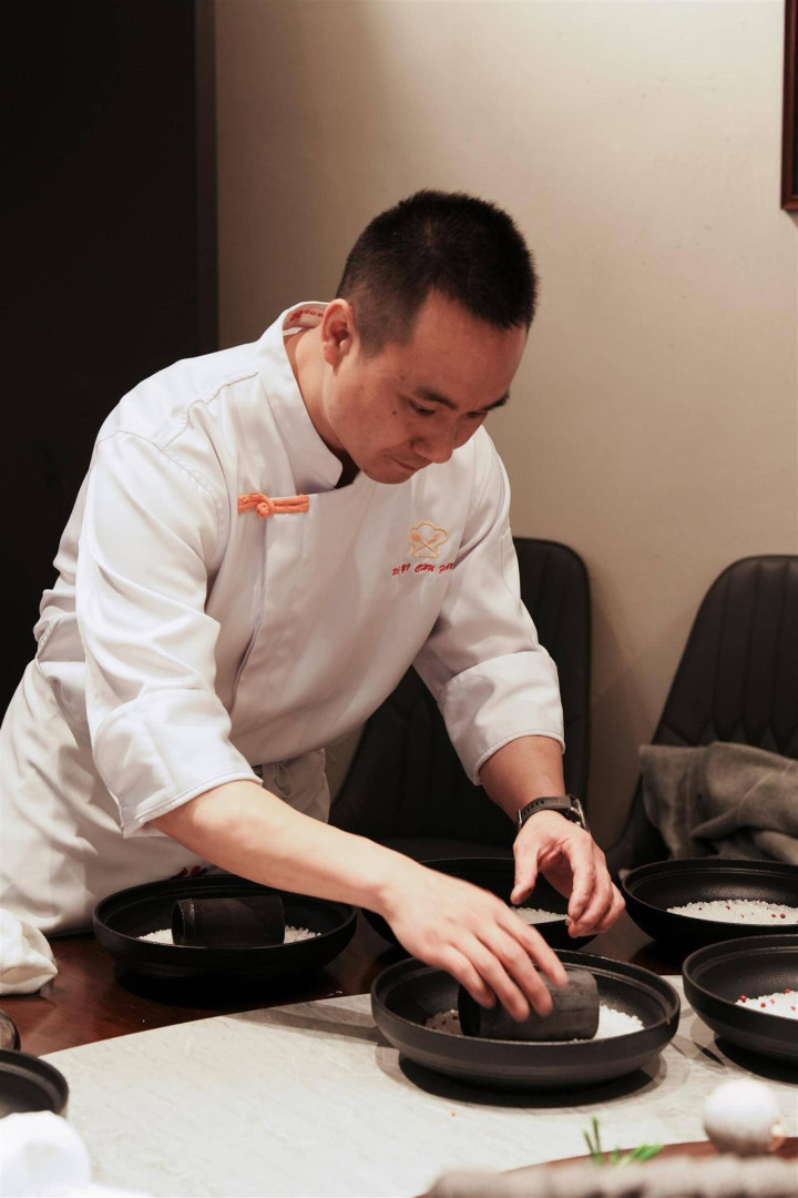 第二道热菜是两头乌佛手馒头,黄花菜铺垫上的红烧肉,色泽诱人,黄色手工馒头形似佛手,在场食客无不感叹技艺精湛。第三道竹炭杜仲养生腰最有仪式感,猪腰片裹在锡纸里,装进黑色的竹炭,烤制完成后摆入雪白粗盐打底的黑色盘中,绿竹叶点缀,摆盘呈现的是水墨中国风,食客需拿铁勺敲开后食用。