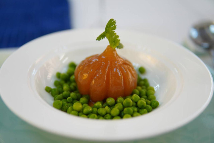 黑金猪手冻、两头乌猪舌、开胃嫩仔姜、甜豆火腿方四道前菜装在开胃碟里,每人一份,各自享用。“除了前菜,菜品现做现上,品鉴会采用分餐制,既可以对食物进行定量控制,又能让大家单独享受美食,符合现代人的饮食习惯。”黄良涛介绍。