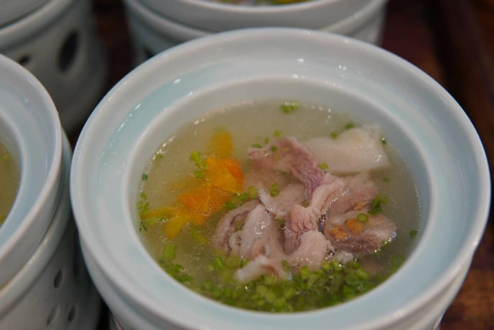 上菜时,每位食客面前摆一个天青色的小圆碗,里面是白色竹荪、黄色鼓槌石斛花,配以碧绿芹菜、香菜,佐以金黄炸蒜油,热乎的清汤一冲,肉香、蒜香随即四溢,虽是清汤,但口感丰富。“比较清口,完全可以感受到两头乌的肉质非常鲜嫩。”上海阳光绿洲生态酒店出品总监丁树林把一碗汤喝了个精光。